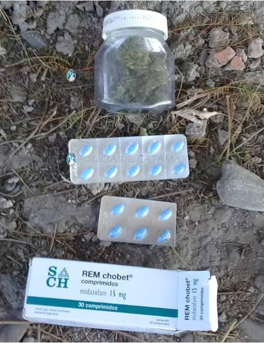 Al momento de realizarles la requisa correspondiente, los Policías encontraron entre las prendas de vestir de uno ellos, un (01) teléfono celular Motorola, de color dorado, la suma de dos mil novecientos diez pesos ($2.910) en efectivo, una (01) balanza gris apta para pesar gramos, dos blíster con dieciséis (16) comprimidos de Midazolam, un (01) comprimido de Clonazepam, un (01) envoltorio de nylon con una sustancia tipo polvo de color blanco, tres (03) cigarrillos de armado casero con una sustancia herbácea, y un (01) recipiente de plástico transparente, que contenía cogollos de Marihuana, por lo que de inmediato solicitaron la presencia de efectivos de la Dirección Drogas Peligrosas de la Policía de la Provincia, quienes tras realizar la prueba de campo correspondiente lograron determinar que se tratarían de una dosis de Cocaína y 8 Gr. de Marihuana, que quedaron en calidad de secuestro a disposición del Juzgado Federal.