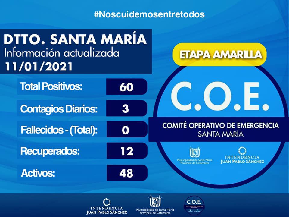 El restante caso positivo que informa el ministerio de salud de la provincia, para el departamento Santa María, pertenece al municipio de San José. Cabe aclarar que por un error involuntario informa en su parte oficial un quinto caso que no es correcto. El total de casos en el departamento para el día de hoy es: 4 (cuatro) casos.