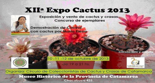 Con el auspicio de la Secretaria de Turismo, Cultura y Deportes de la Municipalidad de San Fernando del Valle de Catamarca, desde hoy, hasta el sabado 12 de octubre, se realizará la XIIº Expo Cactus. Esta exposición será de 19 a 21 horas en el Museo Histórico de la Provincia ubicado en Chacabuco 425.