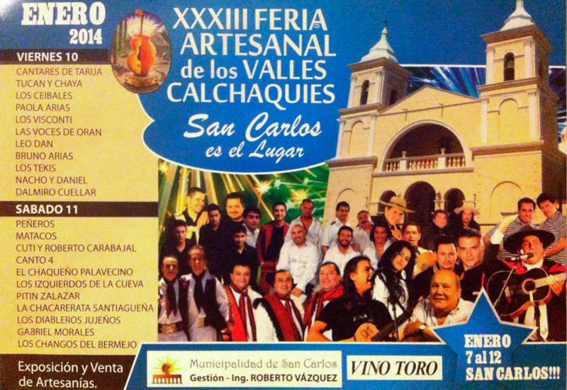 El viernes 10 y el sábado 11 de enero, la localidad cafayateña de San Carlos vivirá la XXXIII edición de la Feria Artesanal de los Valles Calchaquíes, donde la cartelera será el gran atractivo. El Chaqueño Palavecino será la figura central de una cartelera de lujo que también contará con la presencia de Leo Dan, Los Tekis, Cuty y Roberto Carabajal, Los Visconti, Nacho y Daniel, Los Voces de Orán, Pitín Zalazar, Canto 4, Paola Arias, La Chacarerata Santiagueña, Dalmiro Cuéllar, Bruno Arias, Los Izkierdos de la Cueva, Matacos, Tucanychaya, Gabriel Morales y Peñeros.