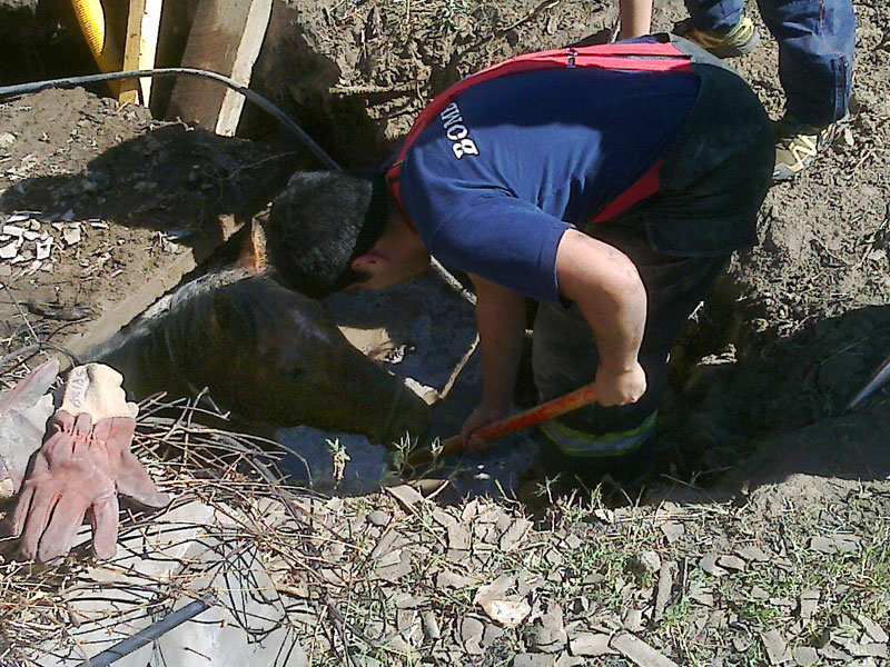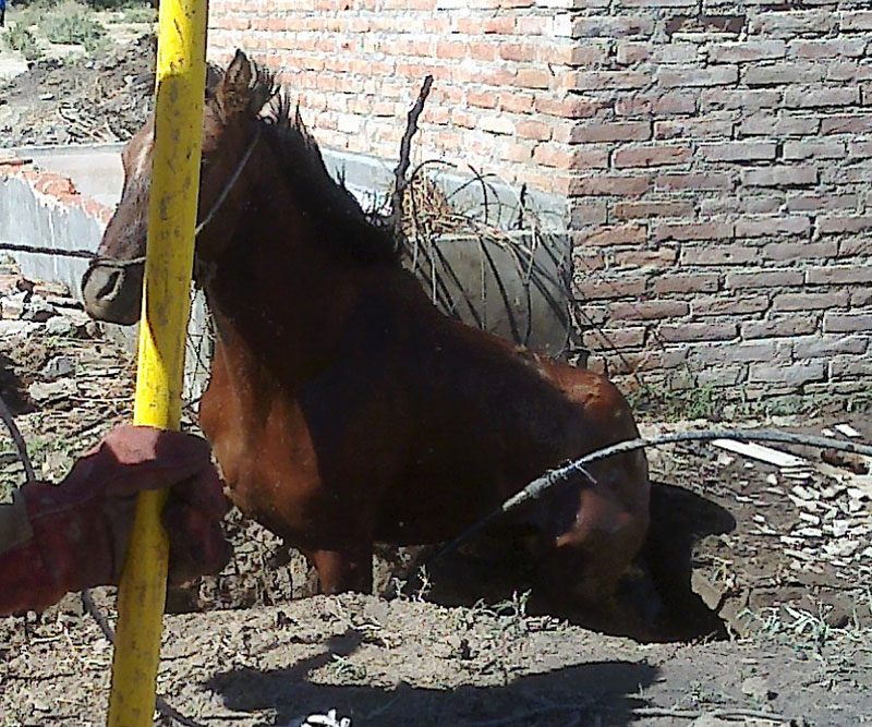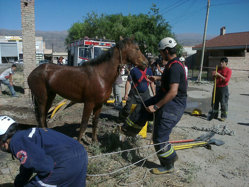 En la mañana de ayer, desde horas 08:30 a 10:30 aproximadamente, frente a la Avenida 9 de julio en cercanías del B° Virgen del Valle, bomberos voluntarios de la ciudad rescataron a un caballo que había caído en un pozo.