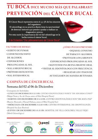 Con motivo de conmemorarse el 5 de diciembre el día Latinoamericano de la lucha contra el cáncer bucal, la Secretaría de Salud y Bienestar Social la Municipalidad de San Fernando del Valle de Catamarca junto a Dirección de Odontología de la Provincia, OSEP y PAMI, colabora en la campaña organizada por la Comisión de Prevención del Círculo Odontológico de Catamarca denominada "Tu Boca dice mucho más que Palabras".
