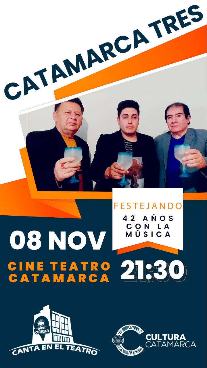 La Secretaría de Cultura de la Provincia invita este el viernes 8 de noviembre a las 21.30 al show del grupo “Catamarca Tres” en la sala mayor del Cine Teatro Catamarca.
