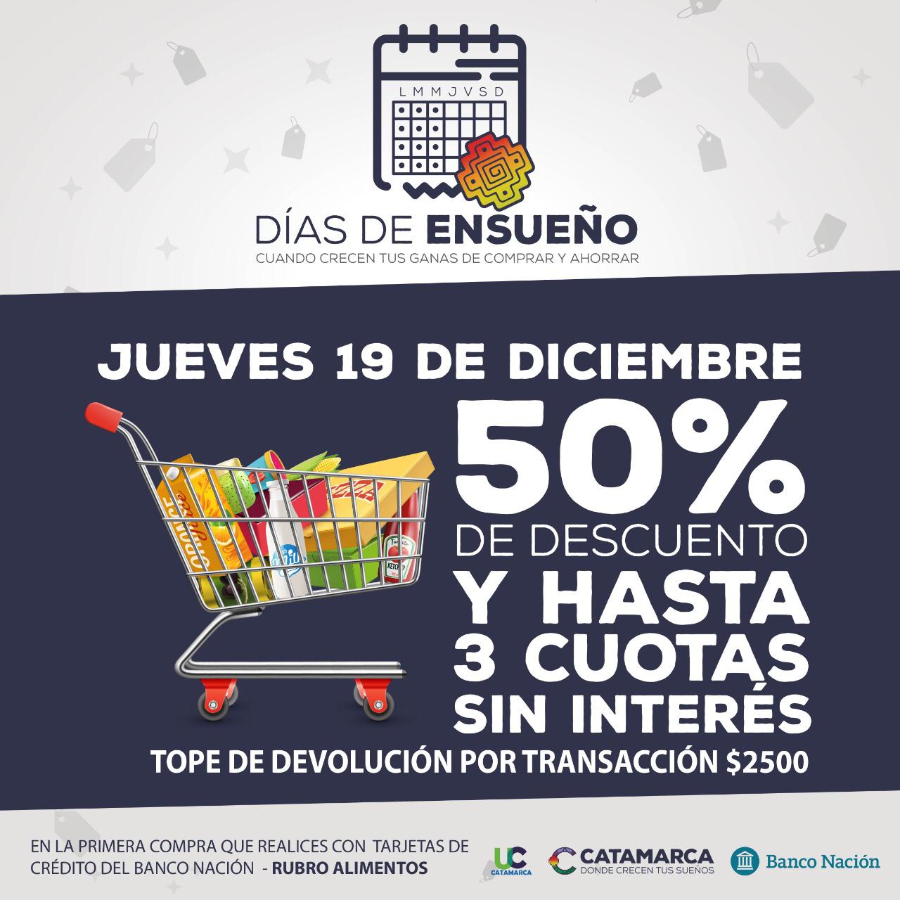 El ministerio de Hacienda informó que el jueves 19 de diciembre los catamarqueños podrán comprar alimentos con el 50% de descuento en los comercios de capitales locales de toda la provincia, con las tarjetas del Banco de la Nación Argentina, a través del “Programa Días de Ensueño”.