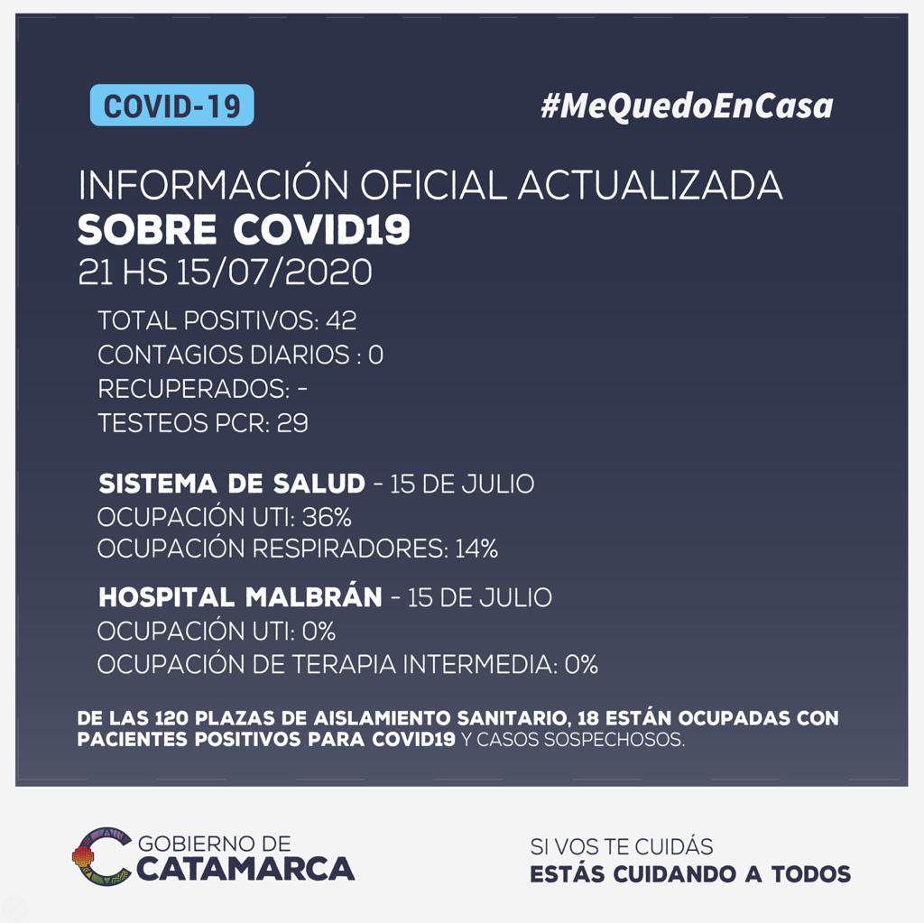 Hasta las 21 horas del miércoles 15 de julio, no se han detectado nuevos casos positivos de coronavirus en la provincia de Catamarca. El total acumulado de casos positivos detectados se mantiene en 42.