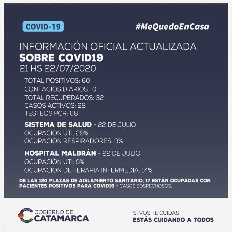 Hasta las 21 horas del miércoles 22 de julio, no se han detectado nuevos casos positivos de coronavirus en la provincia de Catamarca. El total acumulado de casos positivos detectados se mantiene en 60.