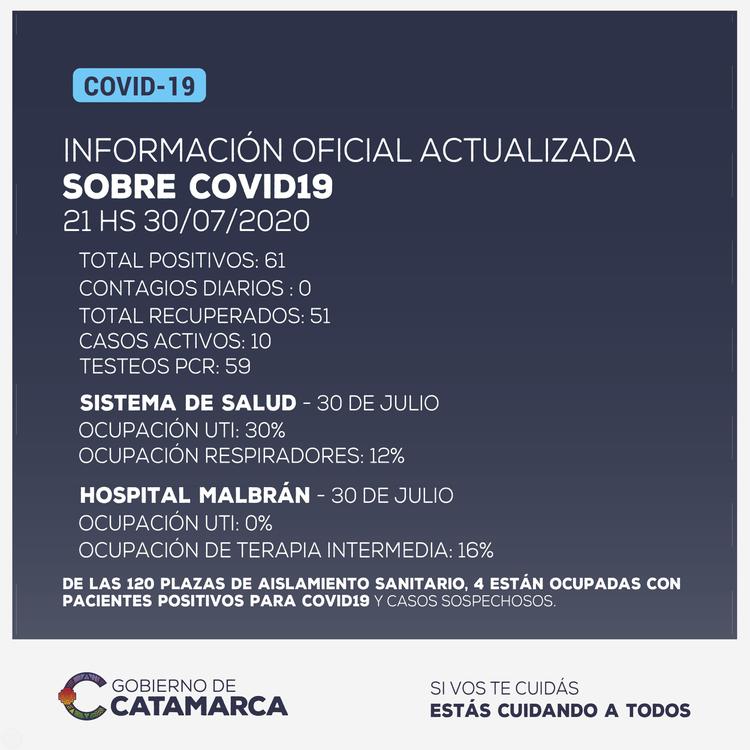 Hasta las 21 horas del jueves 30 de julio, no se han detectado nuevos casos positivos de coronavirus en la provincia de Catamarca. El total acumulado de casos positivos detectados se mantiene en 61. Hoy se registraron 6 pacientes recuperados.