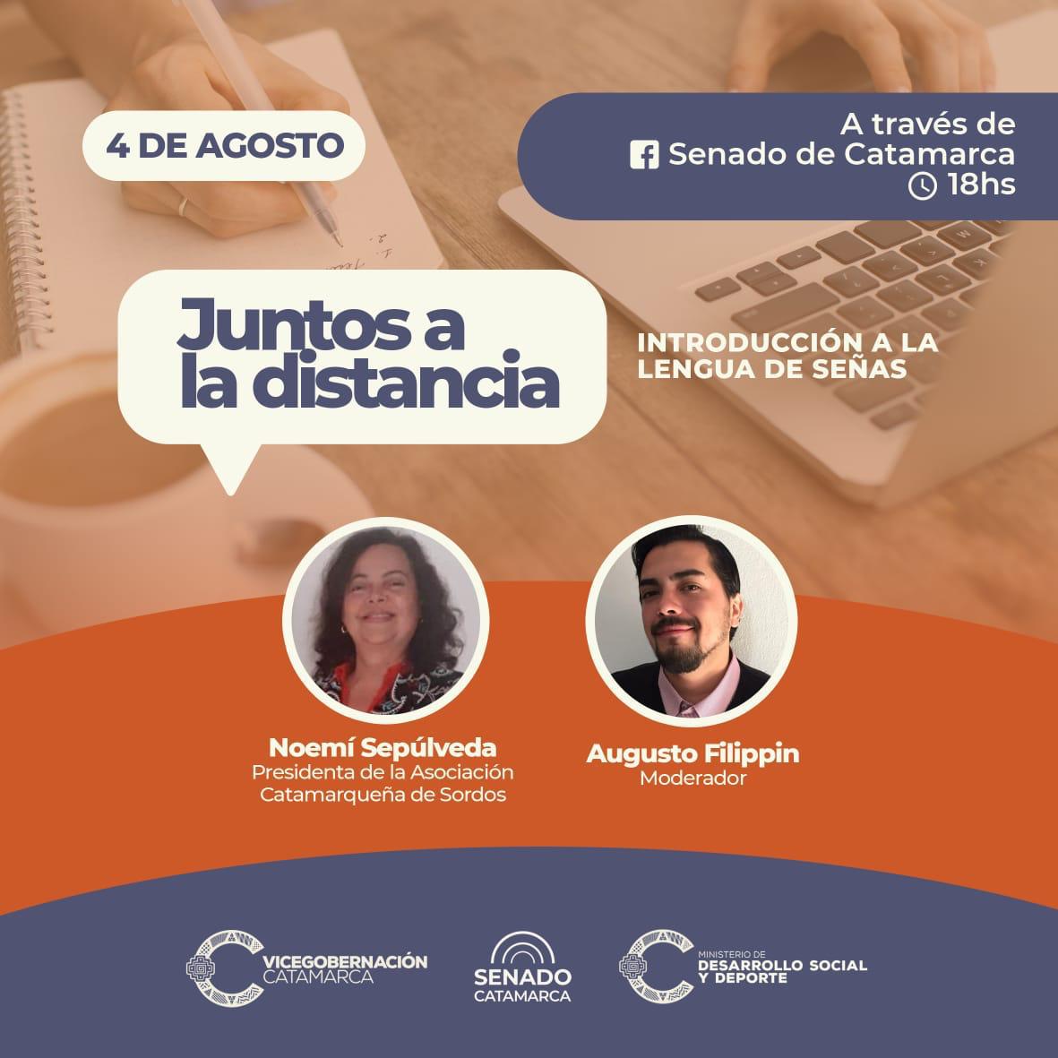 Este martes en #JuntosALaDistancia, el espacio semanal de charlas sumado por Vicegobernación a sus propuestas, invita a escuchar e intercambiar conceptos junto a Noemí Sepúlveda, presidenta de la Asociación Catamarqueña de Sordos, valiosa profesional y referente sobre el tema que será el centro del encuentro, "IntroduccioĚn a la lengua de senĚas", y que tendrá a Augusto Filipín como moderador.