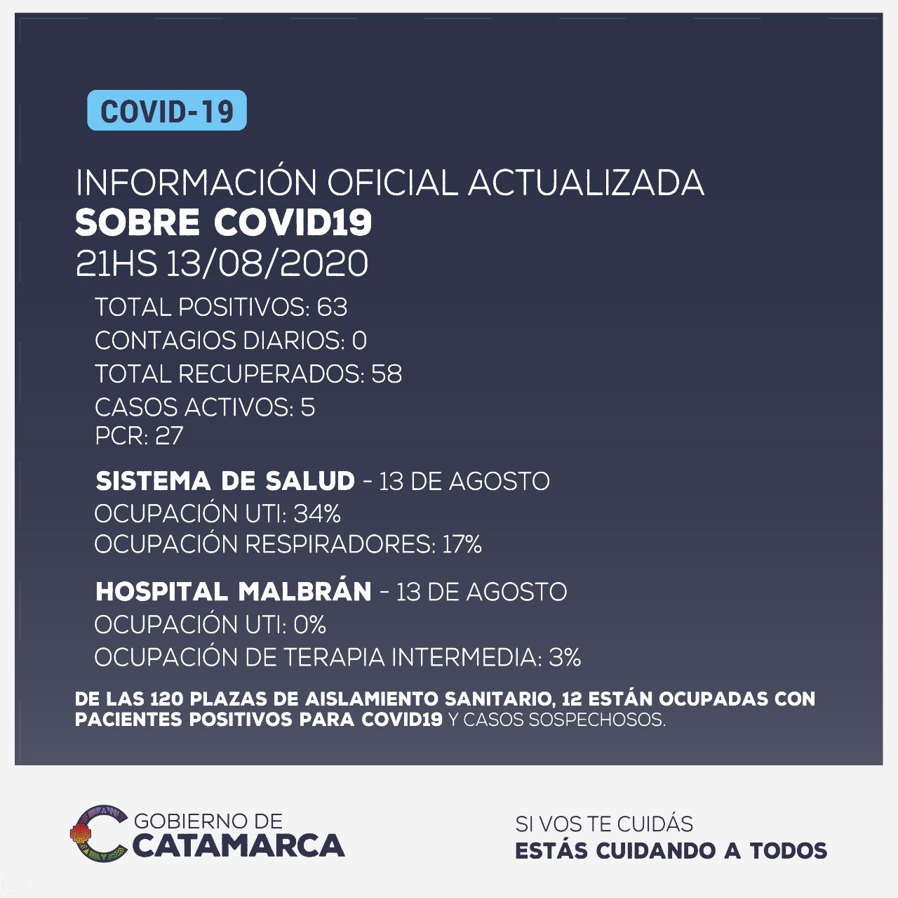 Hasta las 21 horas del jueves 13 de agosto, no se han detectado nuevos casos positivos de Coronavirus en Catamarca. El total acumulado de casos positivos detectados se mantiene en 63. Hoy no se registraron nuevos pacientes recuperados.