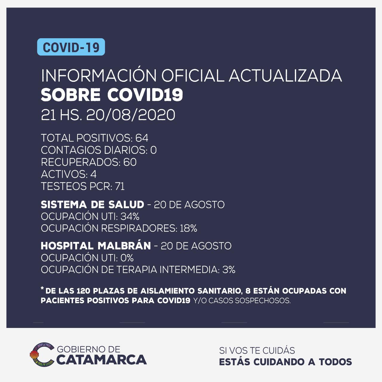 Hasta las 21 horas del jueves 20 de agosto, no se han detectado nuevos casos positivos de Coronavirus en la provincia de Catamarca. El total acumulado de casos positivos detectados se mantiene en 64.