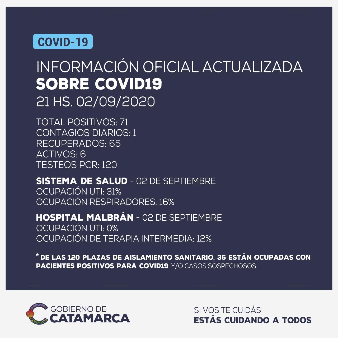 Hasta las 21 horas del miércoles 2 de septiembre, se ha detectado un (1) nuevo caso positivo de Coronavirus en Catamarca.