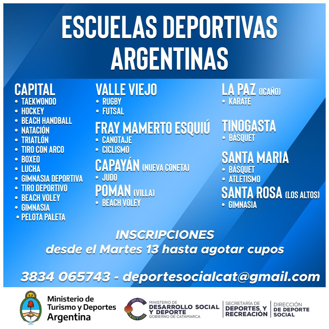 La Secretaría de Deportes del Ministerio de Desarrollo Social y Deportes de la provincia, comenzará con las inscripciones para las 26 Escuelas Deportivas Argentinas que impulsa la Secretaría de Deportes de la Nación que conduce Inés Arrondo y que dependen del Ministerio de Turismo y Deportes que comanda Matías Lammens.