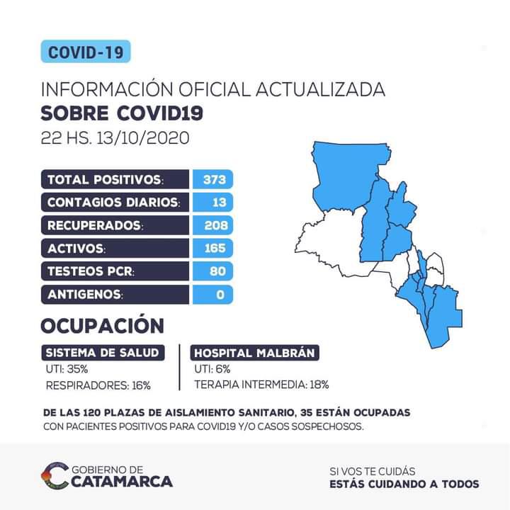 Hasta las 22 horas del martes 13 de octubre, se han detectado 13 nuevos casos positivos de coronavirus en la provincia de Catamarca. El total acumulado de casos positivos detectados asciende a 373.