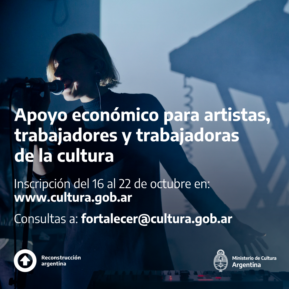 El Ministerio de Cultura de la Nación abre la inscripción a Fortalecer Cultura, un apoyo económico individual no reembolsable para trabajadoras y trabajadores de la cultura que se ejecuturá en tres cuotas de hasta 15.000 pesos por los meses de octubre, noviembre y diciembre con el objetivo de estar cerca de aquellos que más lo necesitan.