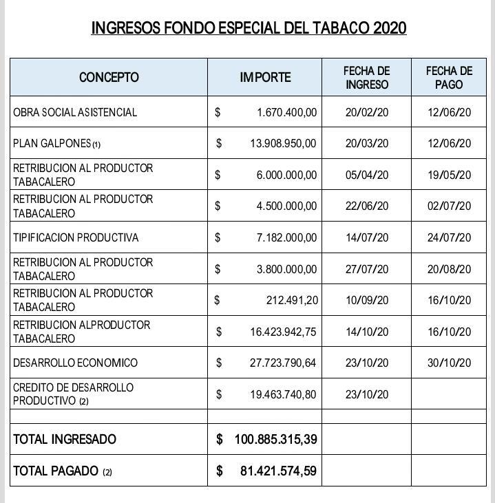 “De esta manera, queremos mostrar transparencia para que cualquier persona acceda a esta información. Todos los meses se acreditaron fondos, y en los últimos diez días transferimos más de 40 millones en pagos de retribuciones al Sector Tabacalero. Son 81 millones más otro tanto que ya tenemos en la cuenta y que acordamos destinar para la cosecha. Se pagarán en los primeros días de diciembre”, explicó Ramaci.