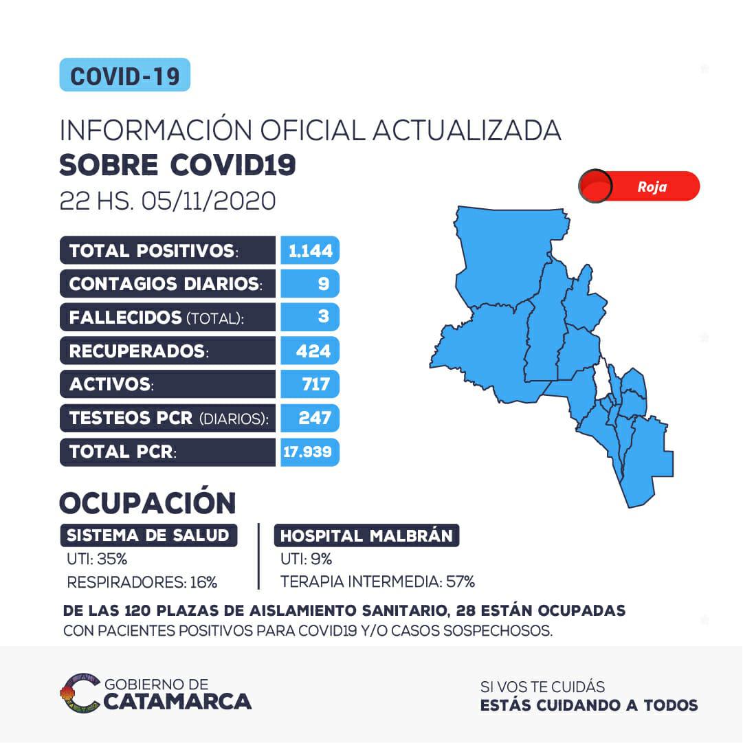 Hasta las 22 horas del jueves 5 de noviembre, *se han detectado 9 nuevos casos positivos de coronavirus* en la provincia de Catamarca. El total acumulado de casos positivos detectados asciende a 1.144.