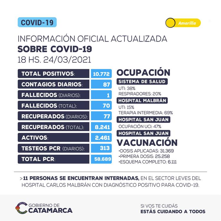 Hasta las 18 horas del miércoles 24 de marzo, se han detectado 87 nuevos casos positivos de coronavirus en la provincia de Catamarca. El total acumulado de casos positivos detectados asciende a 10.772.