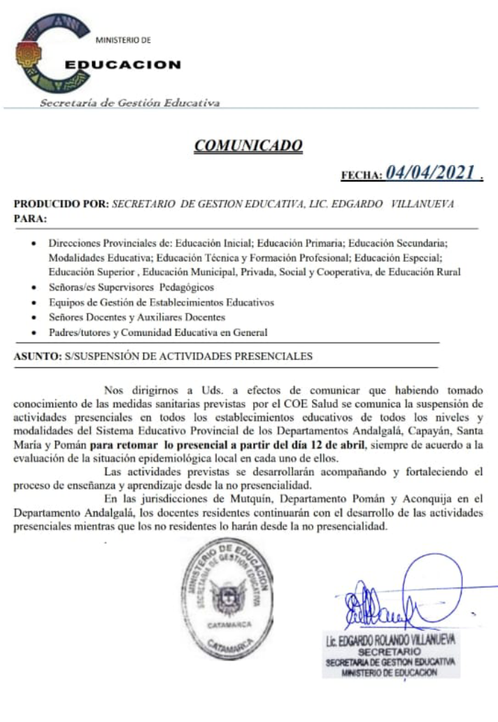Así se informó desde el Ministerio de Educación. La medida alcanza a los departamentos de Andalgalá, Capayán, Santa María y Pomán.