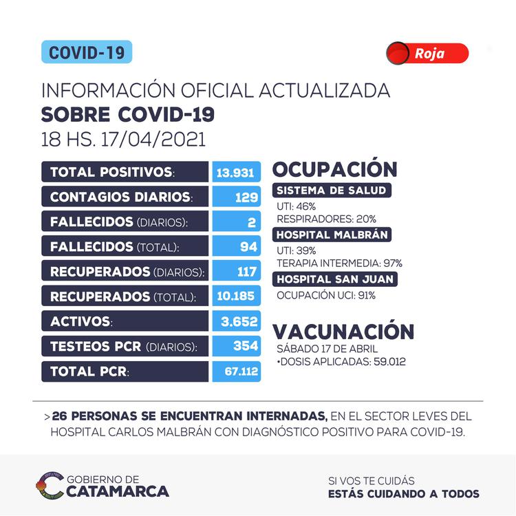 Hasta las 18 horas del sábado 17 de abril, se han detectado 129 nuevos casos positivos de coronavirus en la provincia de Catamarca. El total acumulado de casos positivos detectados asciende a 13.931.
