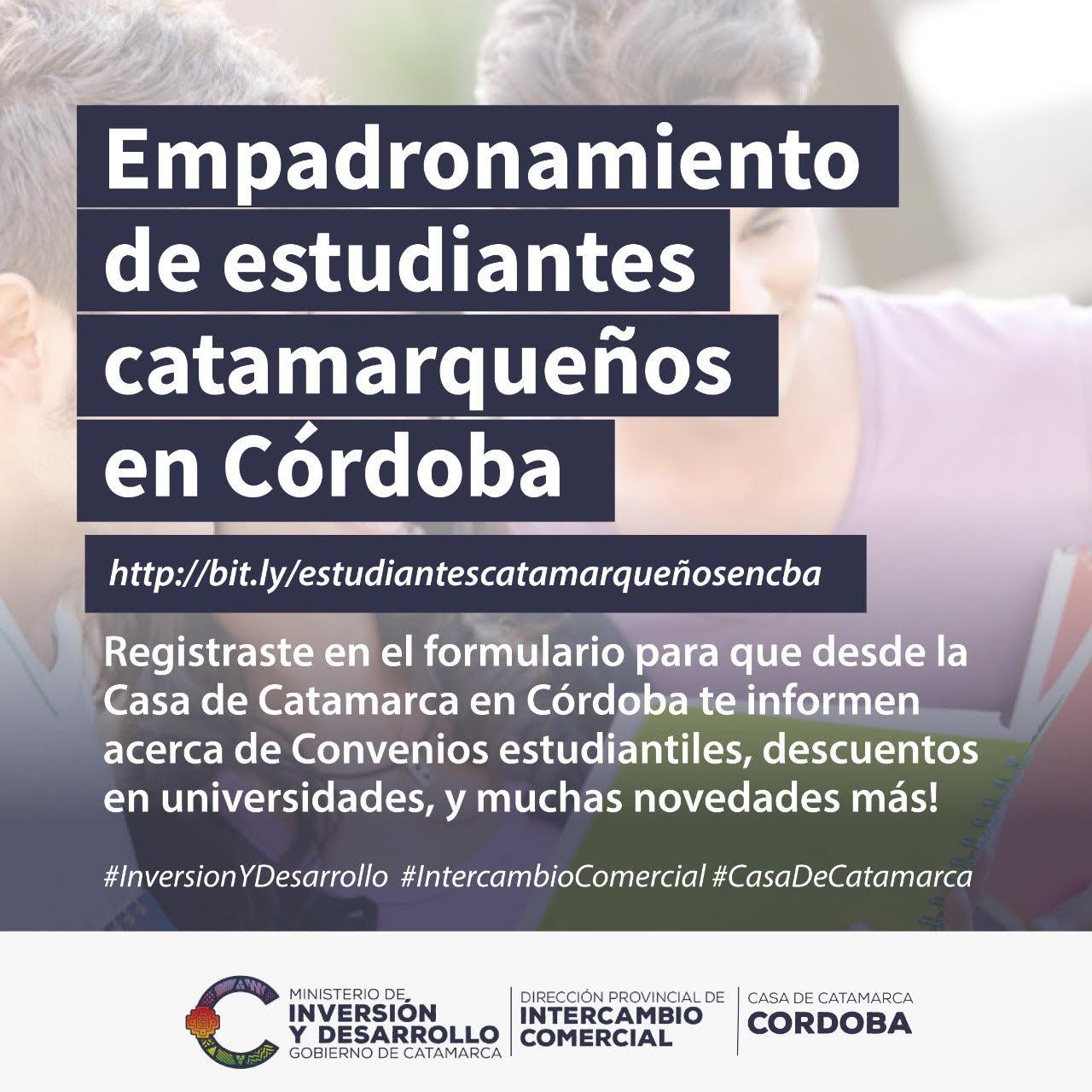 La Casa de Catamarca en Córdoba, convoca a los estudiantes catamarqueños que se encuentren realizando sus estudios en esa ciudad, a registrarse con sus datos en el siguiente Formulario: https://bit.ly/estudiantescatamarqueñosencba