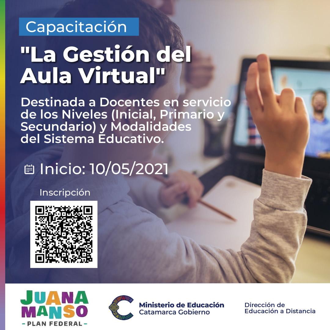 La Dirección de Educación a Distancia del Ministerio de Educación invita a docentes activos de los Niveles Inicial, Primario y Secundario y Modalidades del Sistema Educativo a participar de la capacitación en “La Gestión del Aula Virtual” que dará inicio el próximo lunes 10 de mayo.