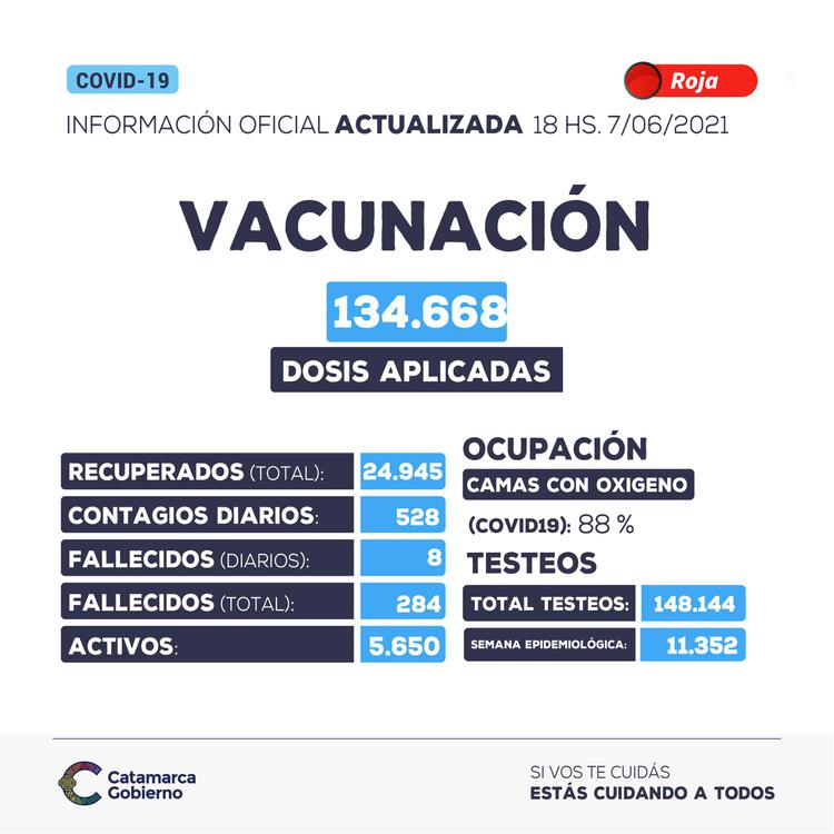 Hasta las 18 horas del lunes 7 de junio se detectaron 528 nuevos casos positivos de coronavirus en la provincia de Catamarca. El total acumulado de casos positivos detectados asciende a 30.879.