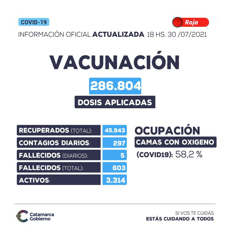 Hasta las 18 horas del viernes 30 de julio se detectaron 297 nuevos casos positivos de coronavirus en la provincia de Catamarca. El total acumulado de casos positivos detectados asciende a 49.860.