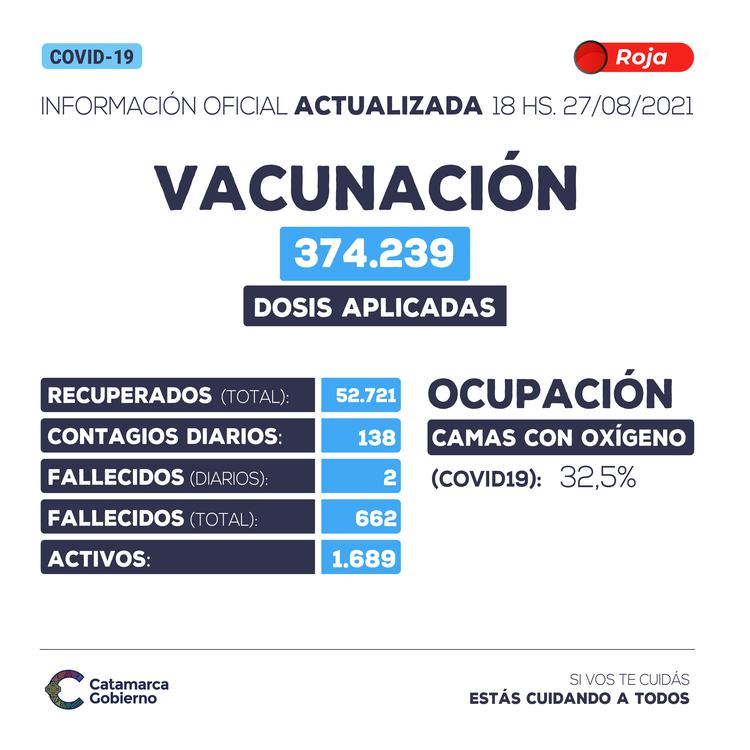 En cuanto al avance de la campaña de vacunación para COVID-19 en Catamarca, el Ministerio de Salud detalla que hasta el día 27 de agosto se aplicaron 374.239 y que las mismas fueron aplicadas a un total de 281.370 personas (Fuente: NOMIVAC).