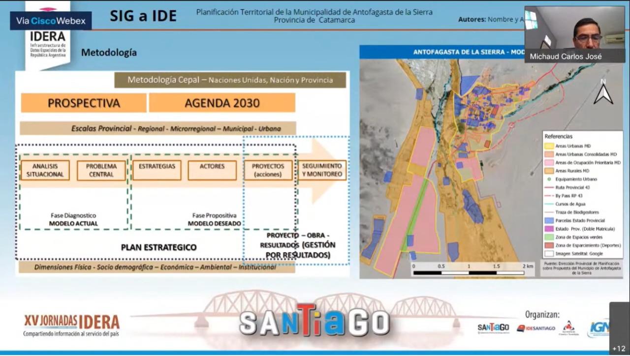 A continuación, compartió el trabajo realizado con Antofagasta de la Sierra y Tinogasta para crear la IDE municipal con el propósito de brindar datos, productos y servicios geoespaciales, realizado bajo estándares permiten el intercambio de información territorial, permitiendo la interoperabilidad con recursos a nivel provincial, nacional y/o usuarios de diferentes ámbitos público o privado, cooperando en la investigación, inversión pública/privada o planificación.