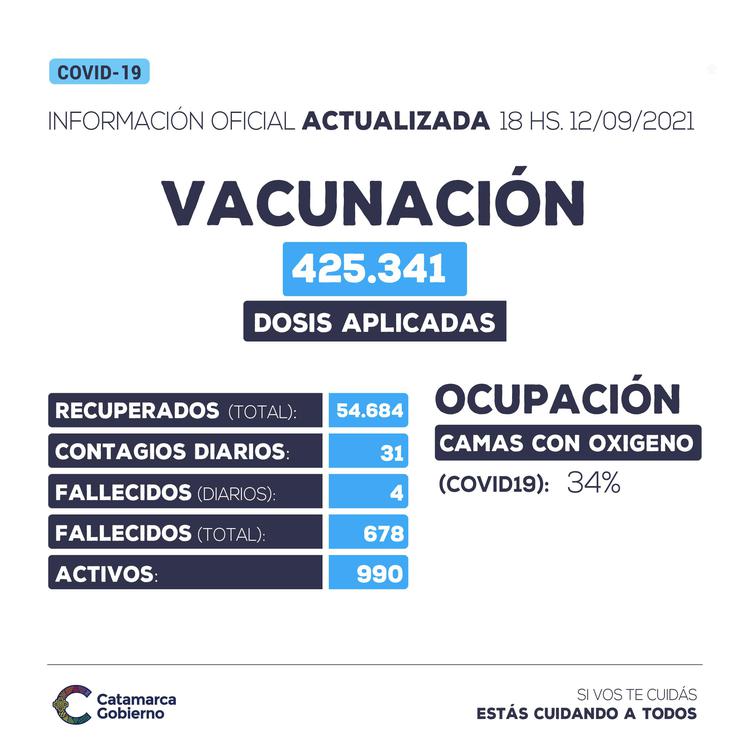 En cuanto al avance de la campaña de vacunación para COVID-19 en Catamarca, el Ministerio de Salud detalla que hasta el día 12 de septiembre se aplicaron 425.341 y que las mismas fueron aplicadas a un total de 291.166 personas (Fuente: NOMIVAC).