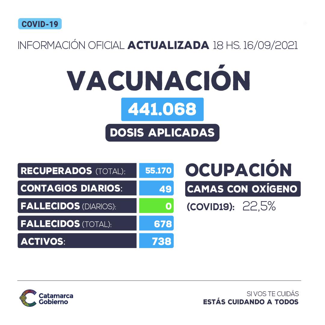 En cuanto al avance de la campaña de vacunación para COVID-19 en Catamarca, el Ministerio de Salud detalla que hasta el día 16 de septiembre se aplicaron 441.068 y que las mismas fueron aplicadas a un total de 292.898 personas (Fuente: NOMIVAC).