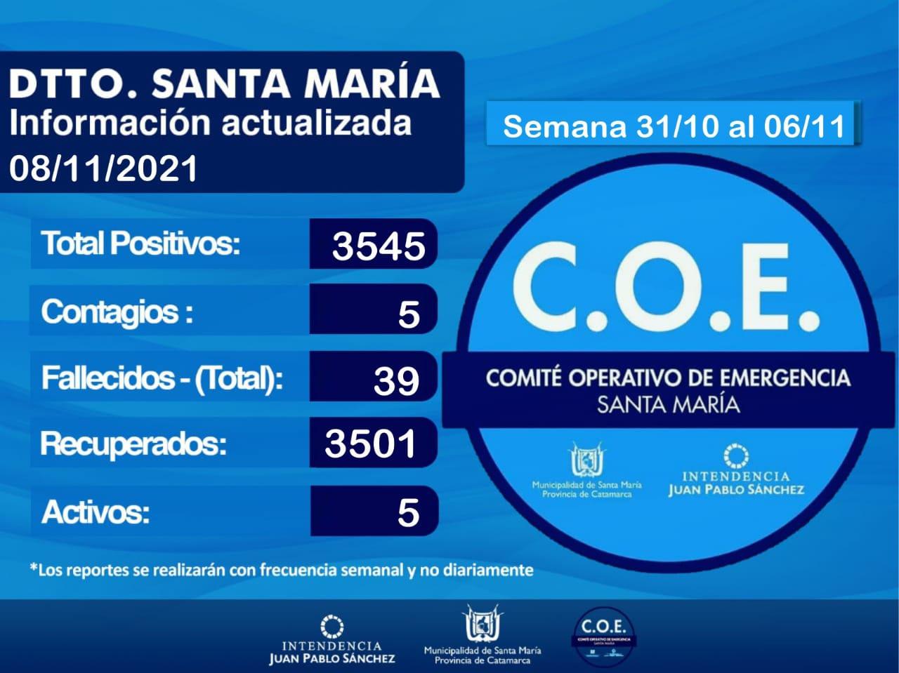 Desde el Comité Operativo de Emergencia se comunica que, a partir del informe del área Covid del Hospital Regional “Luis A. Vargas”, de acuerdo al desarrollo de los protocolos sanitarios que se están llevando a cabo, en la semana que comprende desde el 30/10 al 06/11, 5 (CINCO) muestras arrojaron resultados POSITIVOS.