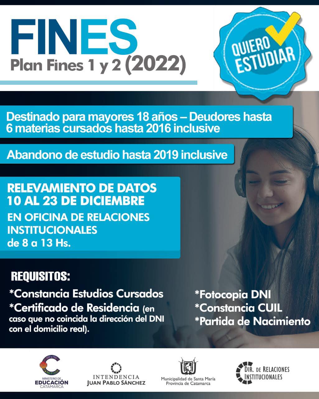 Plan Fines 1 y 2 (2022), destinado a mayores de 18 años que adeudan materias para finalización de estudios de nivel Primario y Secundario de alcance nacional.