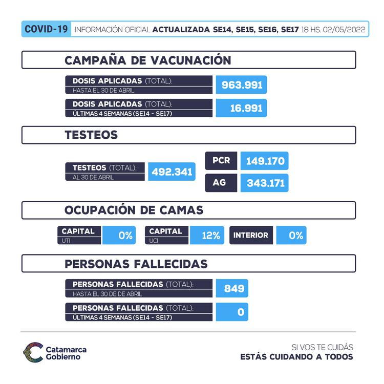 El COE para la prevención de Coronavirus y Dengue informa que hasta el día 1 de mayo de 2022, el Ministerio de Salud aplicó un total de 963.991 vacunas, de las cuales 16.991 se aplicaron en las últimas cuatro (4) Semanas Epidemiológicas (Fuente: NOMIVAC). Con estas dosis aplicadas a 401.392 catamarqueños y catamarqueñas, se ha alcanzado el 88,3% de la población total de la provincia vacunada con esquema de dos dosis. La Dirección de Epidemiología continúa con la carga de datos tardíos correspondientes a vacunación en zonas de escasa conectividad y de SE anteriores.
