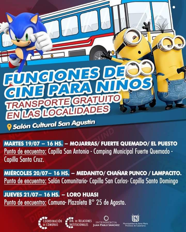Martes 19, miércoles 20, jueves 21 y viernes 22 de julio te esperamos en el cine del Centro Cultural San Agustín para disfrutar de las pelis de los Minions y Sonic.