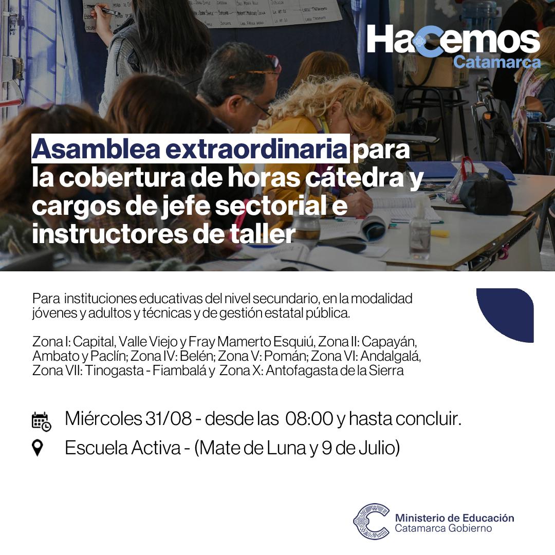 El Ministerio de Educación a través de la Secretaría de Gestión Educativa comunica que por Resolución SGE (ME) N° 70/2022 se autoriza la realización de la ASAMBLEA EXTRAORDINARIA DE OPCIÓN PARA LA COBERTURA DE HORAS CÁTEDRA INTERINAS Y/O SUPLENTES Y CARGOS DE JEFE SECTORIAL E INSTRUCTORES DE TALLER para las instituciones educativas del nivel secundario, en la modalidad jóvenes y adultos y técnicas y de gestión estatal pública para, Zona I: Capital, Valle Viejo y Fray mamerto Esquiú, Zona II: Capayán, Ambato y Paclín; Zona IV: Belén; Zona V: Pomán; Zona VI: Andalgalá, Zona VII: Tinogasta - Fiambalá y Zona X: Antofagasta de la Sierra las que se llevarán a cabo el día miércoles 31 de agosto de 2022 en sede de la Escuela Activa, sita en 9 de Julio 1015 (esquina Mate de Luna) a partir de las 8 horas y hasta concluir.