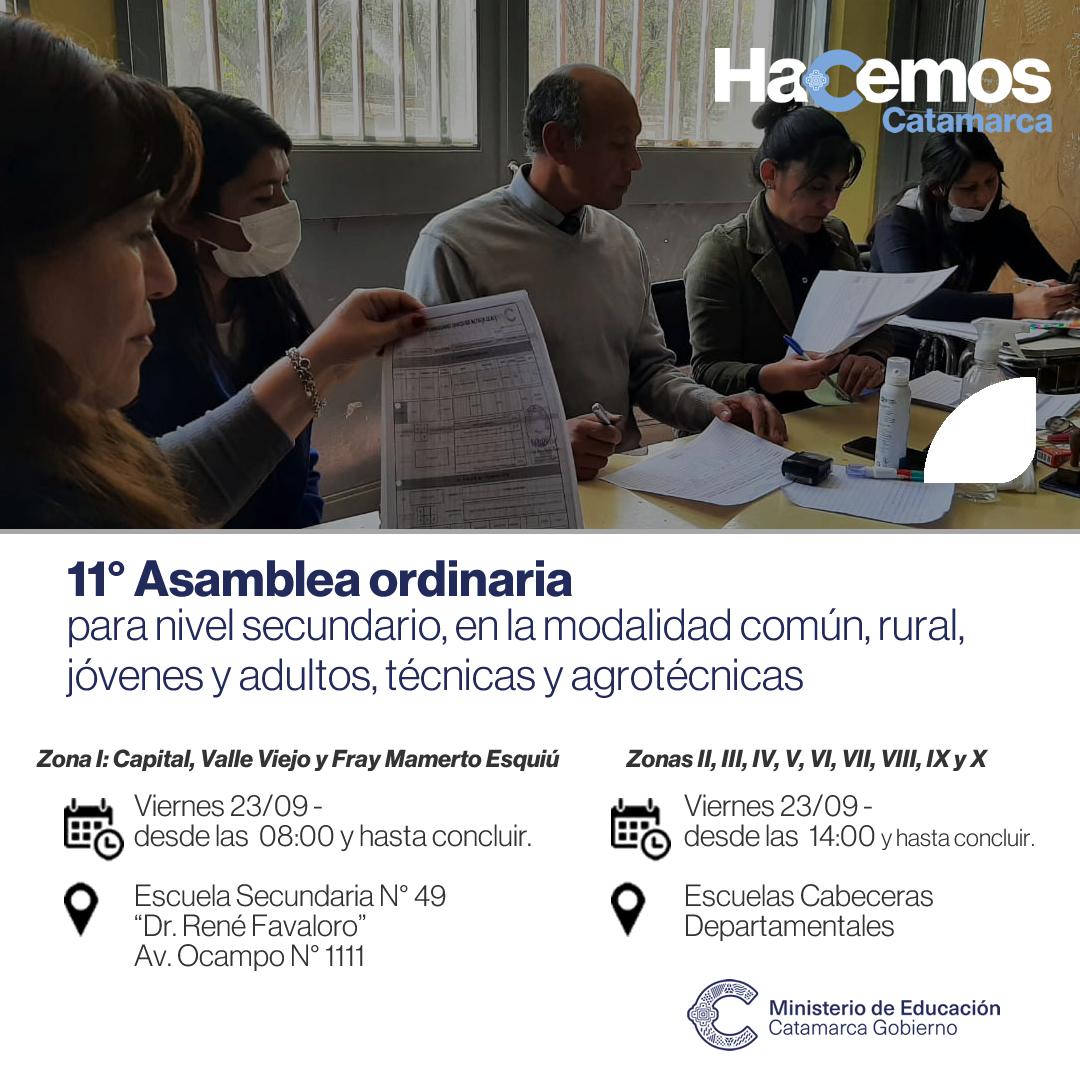 El Ministerio de Educación a través de la Secretaría de Gestión Educativa comunica que por Resolución SGE (ME) N° 86/2022 de fecha 21 de septiembre de 2022 se autoriza la realización de la 11° Asamblea ordinaria de opción para la cobertura de horas cátedra interinas y/o suplentes para las instituciones educativas del nivel secundario, en la modalidad común, rural, jóvenes y adultos, técnicas y agrotécnicas de gestión estatal pública para, Zona II: Capayán, Ambato y Paclín; Zona III: Santa María; Zona IV: Belén; Zona V: Pomán; Zona VI: Andalgalá, Zona VII: Tinogasta - Fiambalá, Zona VIII: Santa Rosa – El Alto, Zona IX: Ancasti y La Paz y Zona X: Antofagasta de la Sierra las que se llevarán a cabo el día viernes 23 de septiembre de 2022 en las Escuelas Cabeceras Departamentales habilitadas a partir de las 14 horas y hasta concluir.
