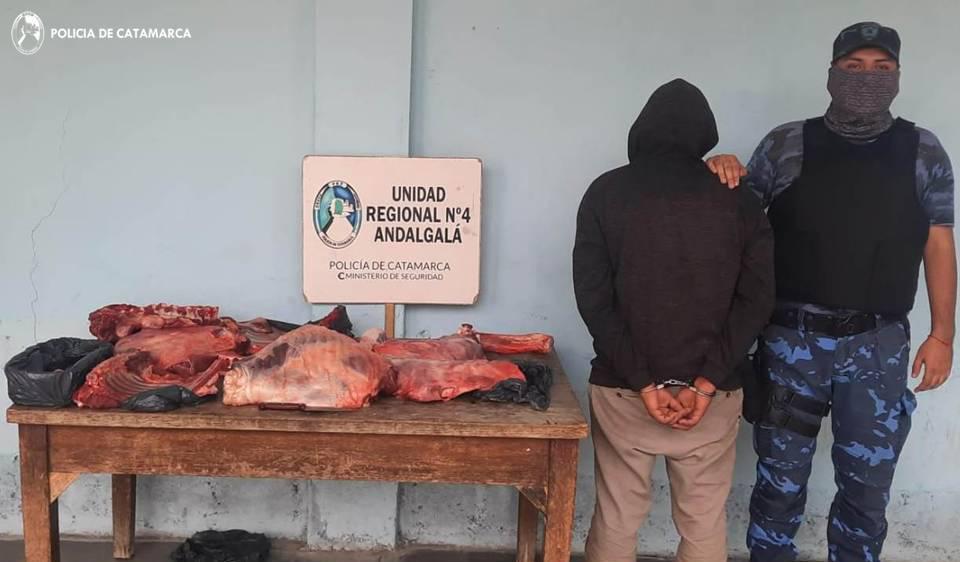 Tras un registro en Andalgalá, personal policial arrestó a un hombre, secuestró carne de un animal mular y plantines de Marihuana