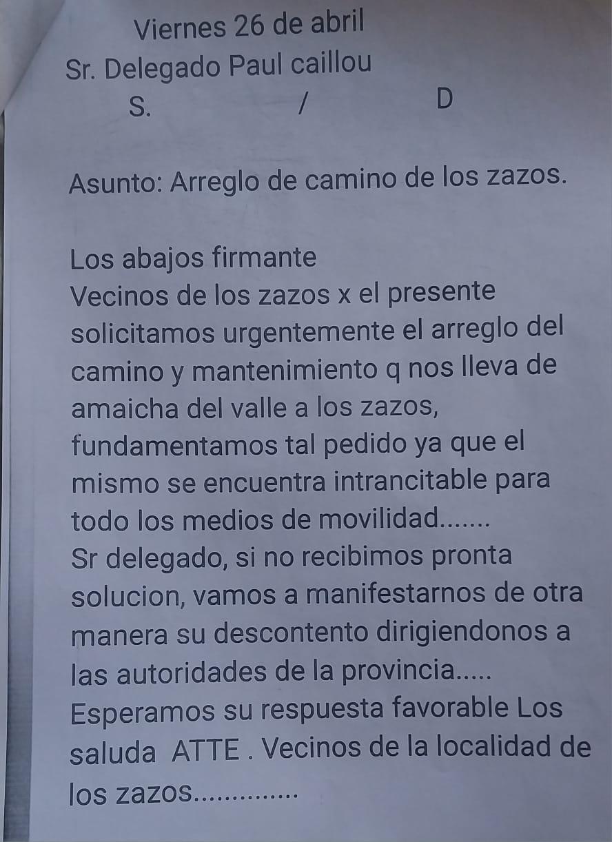 Según lo informador por el periodista Sebastian Arjona, "charlando con vecinos de la localidad de Los Zazos, me manifestaron la necesidad de que se haga público el pedido de una pronta solución al arreglo del camino principal de dicha localidad. Adjunto nota con firmas de vecinos, recientemente presentada en la Comuna Rural de Amaicha del Valle, quedando a una pronta y favorable respuesta para este pedido tan necesario y esencial para los pobladores y visitantes que recorren este camino.".