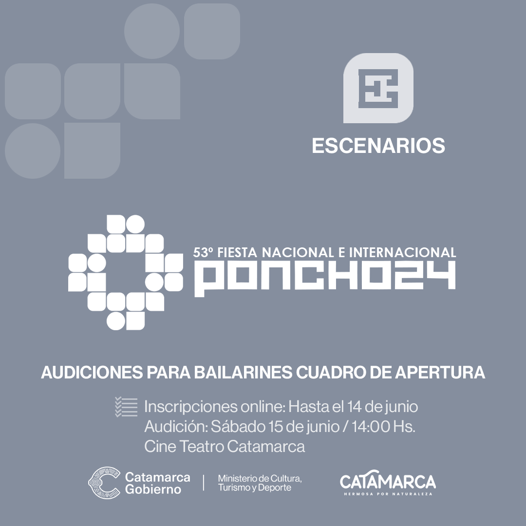 El Ministerio de Cultura, Turismo y Deporte de la provincia, a través de la Dirección de Desarrollo Cultural, junto a la Dirección General de Cultura de la Municipalidad de la Capital convocan a bailarines y bailarinas a participar de las audiciones para integrar el ballet oficial del acto inaugural de la 53° Edición de la Fiesta Nacional e Internacional del Poncho, que se realizará desde el 12 al 21 de julio en el Predio Ferial Catamarca.